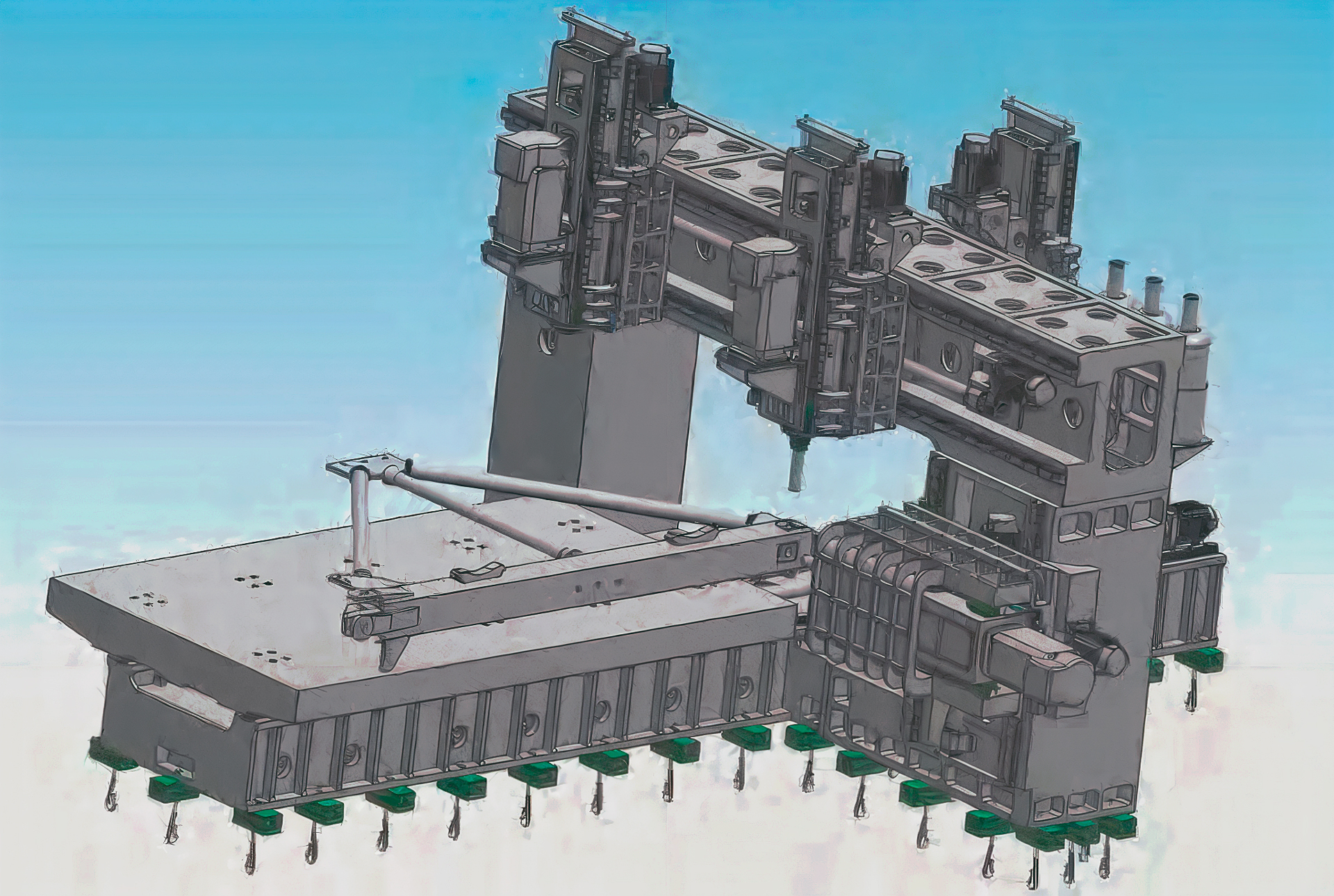 Фрезерно-расточной станок с ЧПУ для спецтехники BOSM (заказной / нестандартный) - портальный многошпиндельный комплекс для точной обработки крупногабаритных узлов. Открытая рамная схема упрощает крановую загрузку и сохраняет жёсткость при тяжёлых режимах.