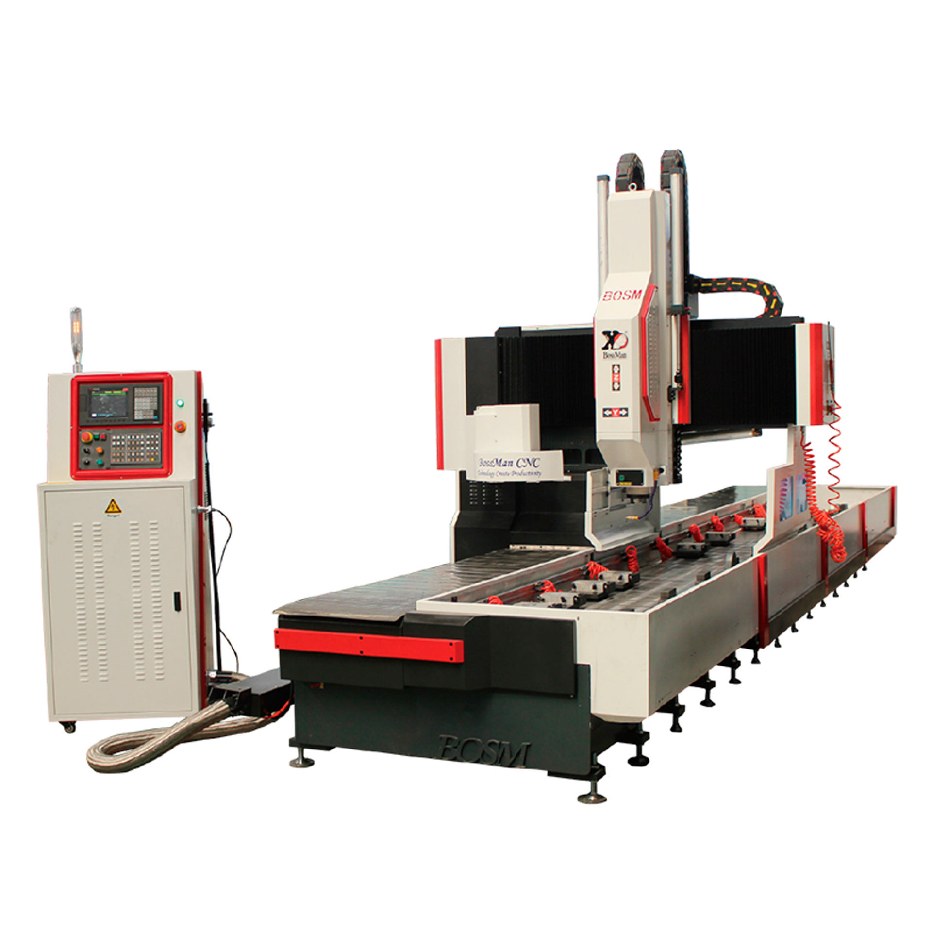 Сверлильный центр с ЧПУ для профилей BOSM-DC6005 - портальная установка для точной обработки профильного проката длиной до 6 000 мм. Открытая рамная схема упрощает базирование протяжённых заготовок и гарантирует беспрепятственный доступ к рабочей зоне.