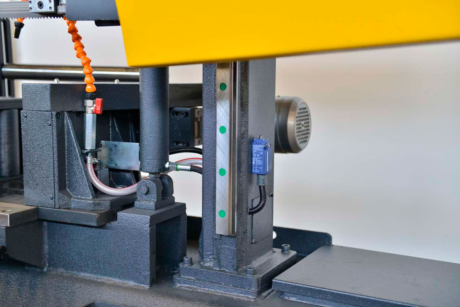 - Система подачи СОЖ охлаждает зону реза — продлевает ресурс полотна и улучшает качество кромки.