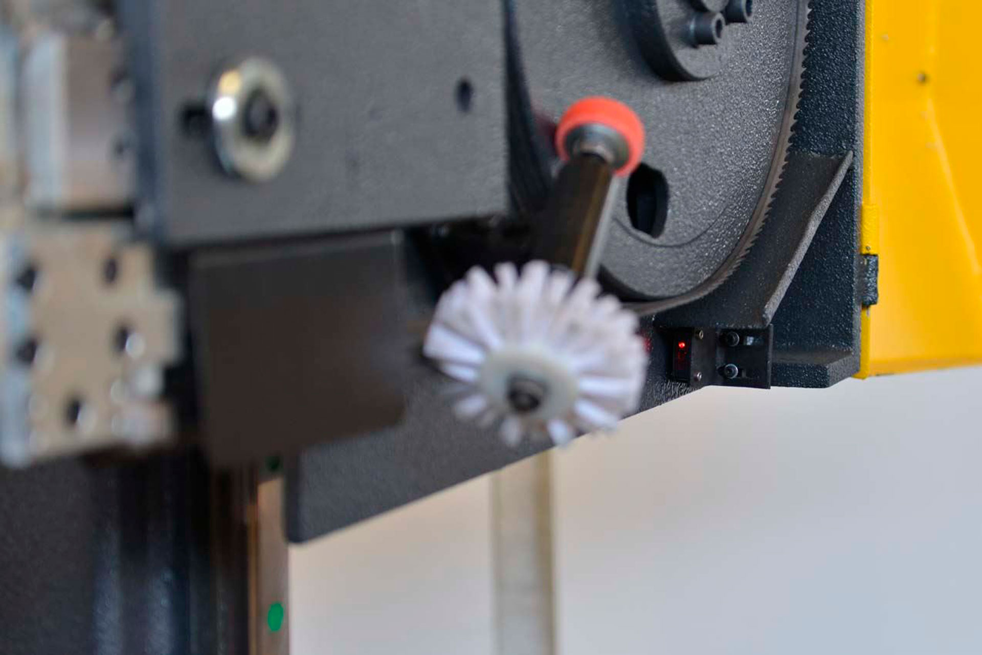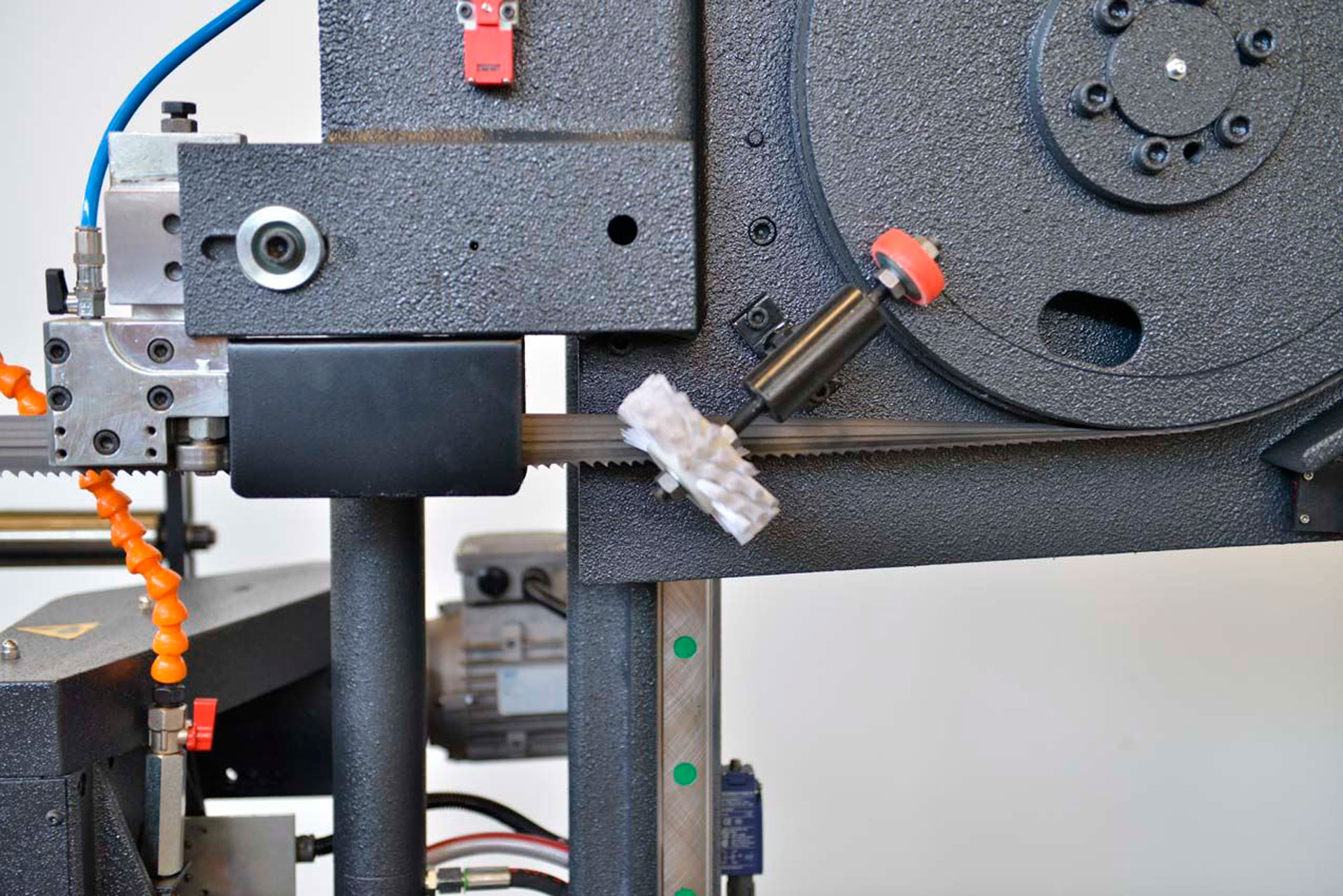 - Щётка автоматической очистки удаляет стружку с полотна — снижает износ и предотвращает перегрев.